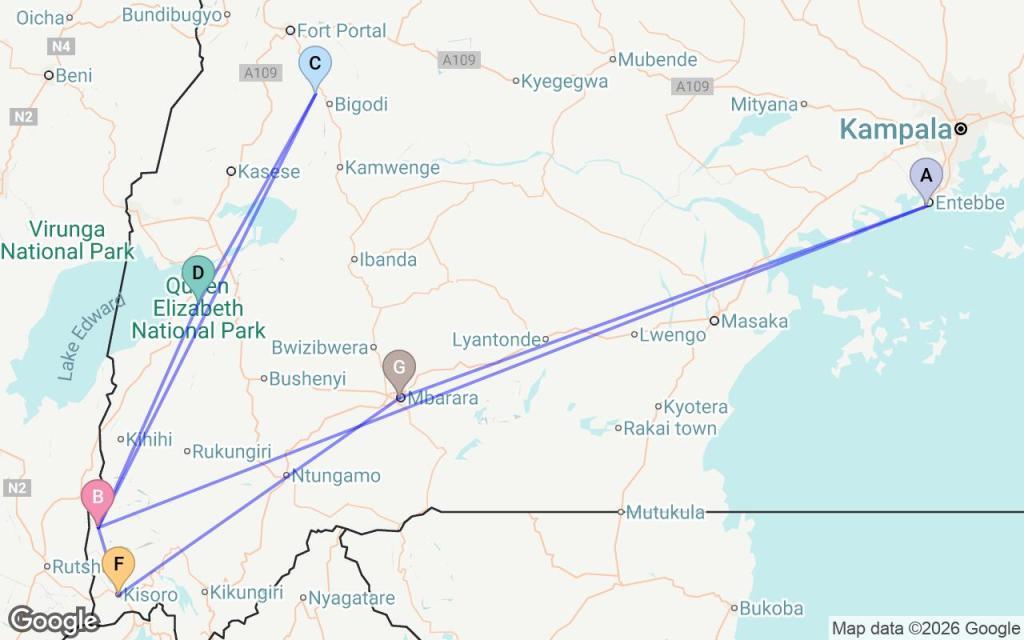 Bwindi Impenetrable National Park | Mbarara | Entebbe | Kibale National Park | Queen Elizabeth National Park | Kisoro