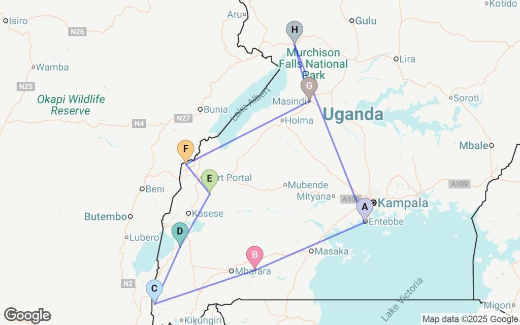 Entebbe | Lake Mburo National Park | Mbarara | Bwindi Impenetrable National Park | Queen Elizabeth National Park | Kibale National Park | Masindi | Murchison Falls National Park | Semuliki National Park